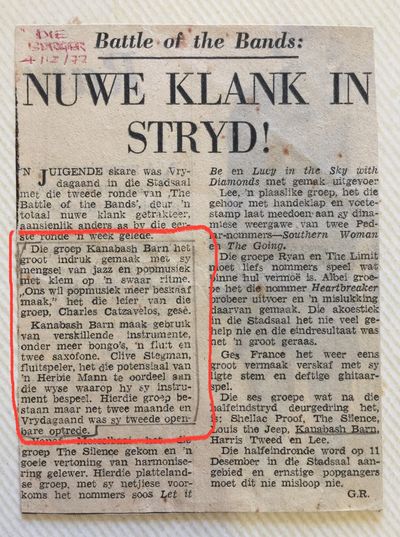 The band Kanabash Barn made a big impression with their mix of jazz and pop music with emphasis on heavy rhythm. “We want to make pop music more civilised," the leader of the group, Charles Catzavelos, said. Kanabash Barn make use of a variety of instruments, among other things bongos, a flute and two saxophones. Clive Staegeman, flutist, has the potential of a Herbie Mann in the way in which he plays his instrument. This group has been together only two months and Friday night was their second public performance.
